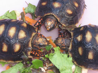 This morning the babies were in rare form. None of them wanted to soak in the bath at all and they were eager to get to their breakfast. Today they had mixed greens, mushroom, zucchini, carrots and optunia, nothing new was on their plate. They were actually taking the food out of each others mouths. You can see in the picture how close they are to one another, they got into those positions by themselves.